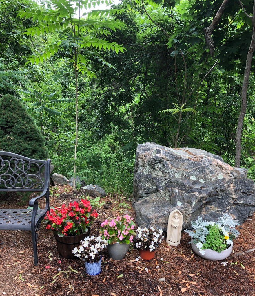 The woods are right behind my house. A lot of small animals come out of the woods from behind the bench. I’m convinced Saint Francis of Assisi is inviting them to spend time in my yard. I’ve seen cardinals, robins, chipmunks, squirrels, and rabbits sitting in front of him. Last week I saw a large hare sitting in front of him!