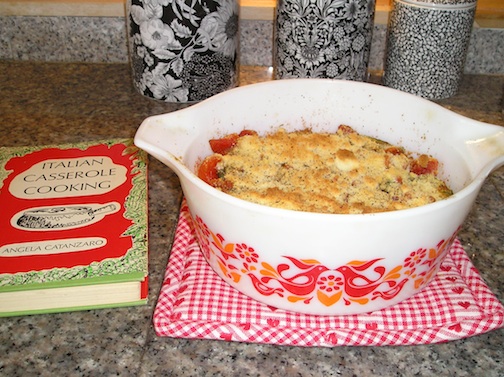 I never knew how unforgiving the camera flash could be until it revealed how much black pepper I (deliberately) put on top of this casserole. Oh well. Here’s the recipe, from 1970’s Italian Casserole Cooking by Angela Catanzaro. According to the back book jacket, Angela is a “diminutive brunette bursting with energy.” oh, you Mad Men-type publishers, you!