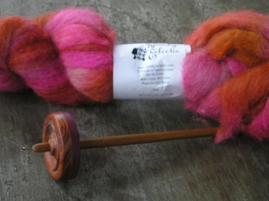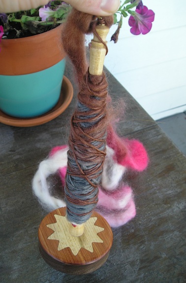 pink, red and brown, and a polwarth top in purple/hot pink/violet shades. I bought a verrry chunky Louet bottom-whorl spindle at Coveted. It was so warm on Sunday evening that I took the purple roving and the spindle out onto my porch, where I spent a frustrating hour trying to spin the polwarth. The staple is shorter on this fiber and I think the Louet spindle is too heavy. I dropped the spindle a lot more than I usually do. Also, it wobbles while it spins. I’m pretty sure it’s not supposed to do that, so either I’m doing something wrong, or the fiber isn’t the right kind for this weight. Unless I got a defective spindle…but I’m sure I’m the problem, somehow. It would be nice to know the weight of the spindle but it wasn’t on the label. Two ounces, maybe? My first ever spindle was a Louet top-whorl spindle of a similar weight, and I avoided it for a long time because I didn’t think it spun well. But once I had more experience at spinning I was able to get the same results with it as with my lighter spindles. I’ll try to spin the polwarth on another spindle, but for now I’m a little disappointed because I really want to use the bottom-whorl.