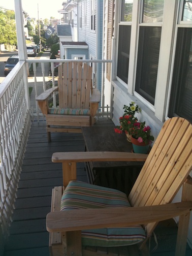 Sunday was hot and sunny and gorgeous, so I made my semi-regular pilgrimage to the urban Mecca known as Home Depot. So did a boatload of other people. I like Home Depot. I’m a crafty gal, but I’m not the type of person who can build a deck or redo their kitchen by themselves. No, I like to dip my toes into the kiddie pools of DIY, if you will: such as the paint section, garden furniture, and the gardening department. For a year my goal has been to dog-proof my deck (on the 2nd floor) so my dog can’t slip under the gap under the railing. Mine was a simple no-frills solution involving 16 2-ft. sections of plastic picket fencing and a bunch of plastic zip ties. I just turned the fencing upside down so the spikes normally stuck into the ground were facing up, with the inverted fencing covering the gap. I tied it to the deck railing with a zip tie on either side of each fence and voila! Spike can relax and enjoy the deck along with his humans. I love a good reason to go to Home Depot, and since I needed to make a trip anyway, I decided it was time to give the whole deck a makeover, Martha Stewart-style. That is, if Martha Stewart lived in a triple-decker and had champagne tastes but a TJ Maxx budget. 🙂