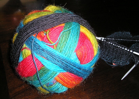 This is the ball of Zauberball sock yarn I bought last week. My LYS assured me that one ball will make a complete pair of socks. It was hard to pick a color from the variety of multicolored balls at the shop. but I couldn’t resist the blues and oranges in this ball of rainbowy goodness. This yarn is incredibly soft and lofty; you can see the halo around it in the photo. I’m only on the cuff but already I’m dreaming about wearing socks made from this. I bet they’ll be incredibly soft. I will be taking my mom to some doctor appointments this week, and socks are a good waiting-room project.
