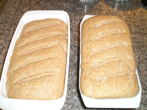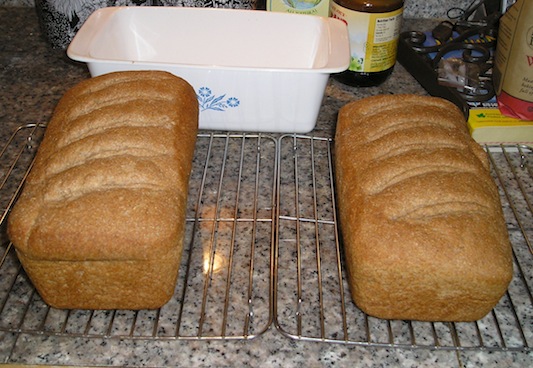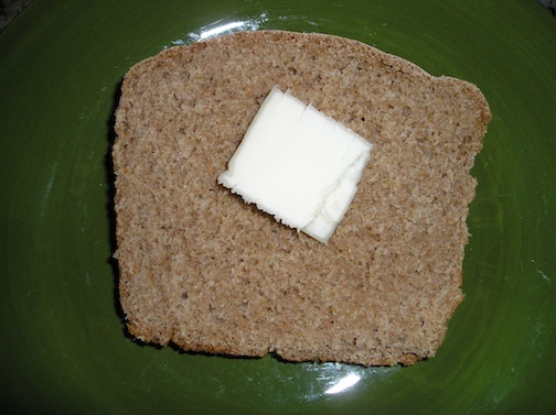 According to the Sandlers, the bread should have lots of tiny holes, if kneaded and prepared correctly. Otherwise it’s full of large holes. Looks like small holes to me! The whole house smelled like fresh bread, it was incredible. I’ve never eaten warm, just-baked bread before. It was fantastic with a little margarine on it. There’s no white flour in this,only whole wheat, so the bread is incredibly dense. I’m happy because now I’m all set for sandwich bread for several days.