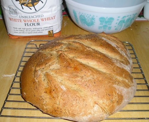 I had a rare burst of energy yesterday (Sunday) that included some much-dreaded but much-neede housekeeping and some lightbulb changing, topped off with a little domestic goddess-ness. Godliness? In other words, I baked homemade bread. For the first time ever. And you know what? It was easy. I’ve always assumed it was somewhat of a chore, with the yeast rising and the kneading, but it was a cinch. Forget those fancy bread-making machines. All you need is a big bowl, an oven and a pair of (clean) hands.
